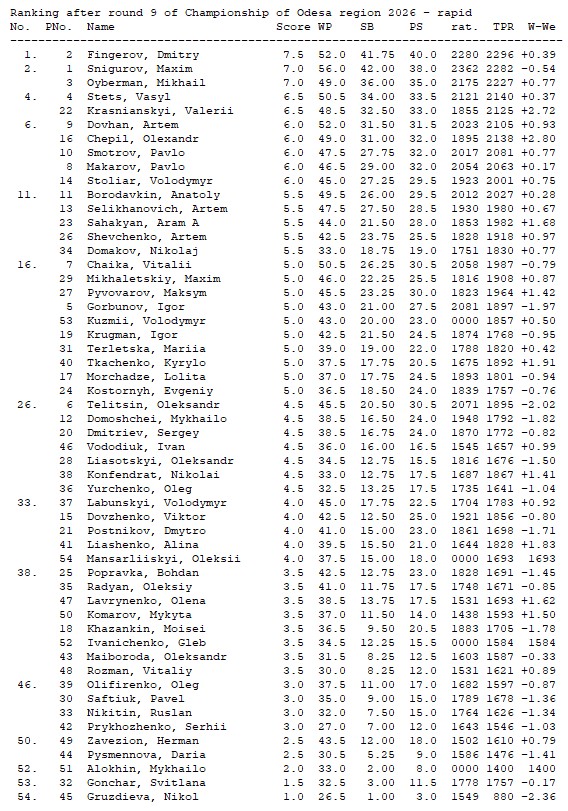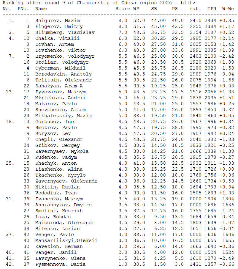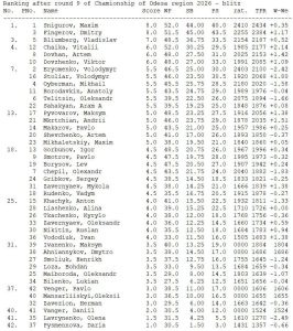 Ranking after round 9 of Chamionship of Odesa region 2026 — blitz